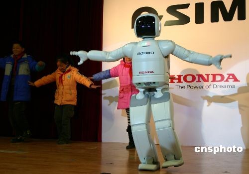12月9日,目前世界上最先進(jìn)的類(lèi)人型機(jī)器人ASIMO在四川都江堰進(jìn)行系列節(jié)目表演,拉開(kāi)“ASIMO中國(guó)行”系列活動(dòng)的序幕。圖為ASIMO與當(dāng)?shù)睾⒆颖荣悊瓮泉?dú)立。中新社發(fā) 黃永莉 攝