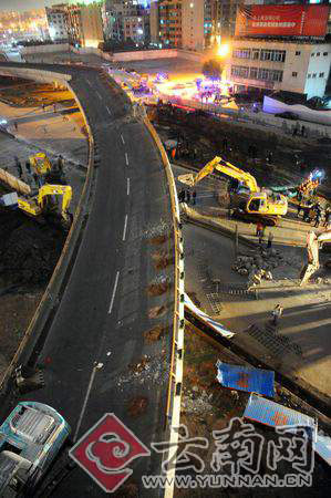 昨日19時30分許,昆明小莊立交橋下昆曲匝道橋在拆除時,發(fā)生橋面坍塌。經(jīng)初步調(diào)查,事故造成2人死亡、4人受傷,受傷人員被及時送醫(yī)院救治。事故發(fā)生后,昆明市張祖林市長、杜敏副市長、陳勇副市長,省交通廳吳衛(wèi)平副廳長隨即趕到現(xiàn)場組織指揮處置工作,成立事故處置現(xiàn)場指揮部,昆明市公安、衛(wèi)生、建設、安監(jiān)、交通等部門工作人員趕赴現(xiàn)場處置,立即啟動《昆明市突發(fā)公共事件總體應急預案》及相關部門專項預案,調(diào)集昆明市建筑工程應急救援隊到達現(xiàn)場,按有關規(guī)程開展現(xiàn)場搜尋、救援、清理、疏通、善后等工作。經(jīng)專家組現(xiàn)場初步勘查,小莊立交橋拆除中發(fā)生坍塌的主要原因?qū)偈┕挝贿`反操作規(guī)程,導致被拆除橋梁突然坍塌。目前,事故救援及善后等相關工作正有序進行。