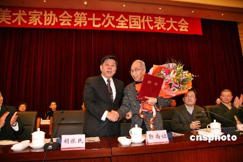 中國(guó)文聯(lián)黨組書記、副主席胡振民給新當(dāng)選的中國(guó)美協(xié)榮譽(yù)主席靳尚誼頒發(fā)聘書。中新社發(fā) 王保勝 攝