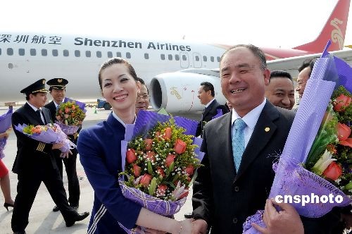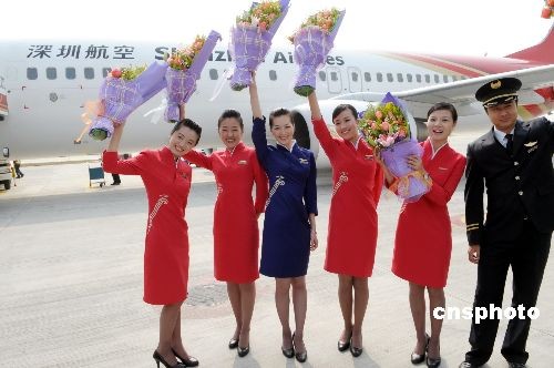 圖為擔(dān)任本次兩岸常態(tài)包機直航的深航空姐從臺北喜悅歸來。中新社發(fā) 陳文 攝