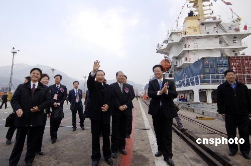 海峽兩岸關(guān)系協(xié)會(huì)副會(huì)長(zhǎng)王在希以及福建省相關(guān)領(lǐng)導(dǎo)在福州青洲港區(qū)揮手送別承擔(dān)兩岸海上直航首航任務(wù)的船員。