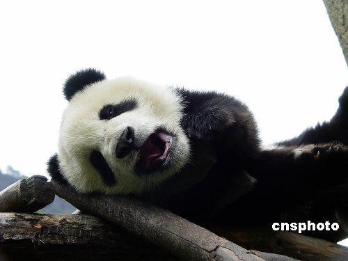 2005年4月19日拍攝的8個月的“圓圓”,趴在樹枝上賴床還鬧脾氣。中新社發(fā) 何永果 李偉 攝