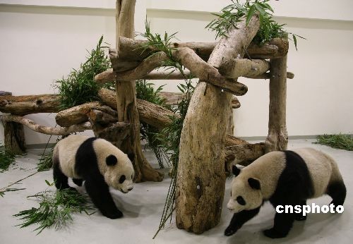 圖為經(jīng)歷了一天旅途勞頓的“團(tuán)團(tuán)”和“圓圓”在新房間里團(tuán)聚。 中新社發(fā) 路梅 攝