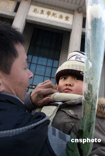 12月26日毛澤東115周年誕辰日清晨,一名四川地震災(zāi)區(qū)的三歲男童與父親到位于北京天安門廣場的“毛主席紀(jì)念堂”敬獻白菊鮮花,深切懷念偉大領(lǐng)袖毛主席。