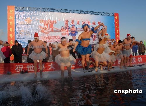 12月27日,首屆黑河市冬泳節(jié)開幕暨中俄健兒冬泳賀新年表演活動在界河黑龍江舉行。黑河市百余名冬泳健兒與來自俄羅斯布拉戈維申斯克市的20余名冬泳隊(duì)員進(jìn)行了中俄雪地足球?qū)官悺⒒竞吞记杀硌莸。旨在打造黑河地域特色旅游文化活動品牌,大力營造“兩節(jié)”期間喜慶和諧的文化氛圍。如今,中俄冬泳表演活動已經(jīng)成為展示黑河、宣傳黑河的“名片”。