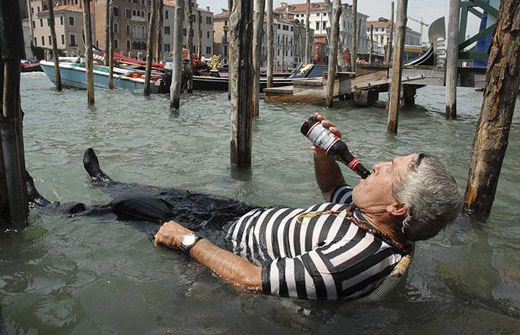 8月5日,威尼斯,在水中喝啤酒的老人。