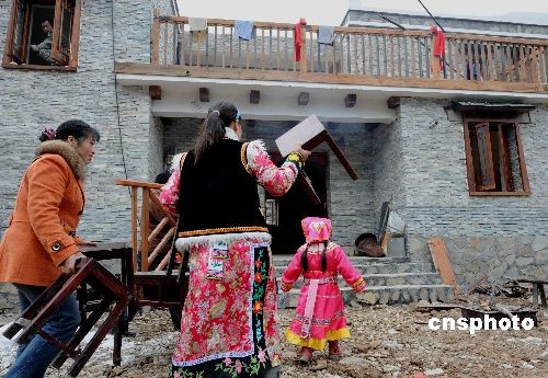 12月31日,四川地震極重災(zāi)區(qū)的北川縣一戶羌族災(zāi)區(qū)民眾,在2008年最后一天搬進(jìn)貓兒石新建的羌寨農(nóng)家。中新社發(fā) 賈國榮 攝