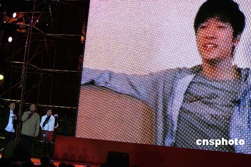 上海:2008年的最后一個夜晚,劉翔的父親劉學根(左中)親臨在上海黃浦江畔舉行的可口可樂“暢爽開心年,新春齊分享”新年倒計時晚會,并現(xiàn)場與遠在美國療傷的劉翔一起,通過視頻,共唱新年快樂歌。 中新社發(fā) 潘索菲 攝