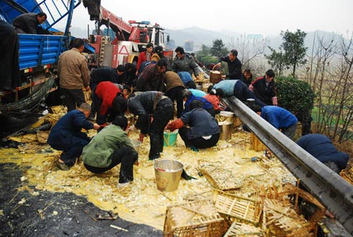 1月4日早晨6時(shí)40分,一輛滿(mǎn)載7噸鮮鴨蛋的湖北小貨車(chē),因躲避快速車(chē)道的一輛汽車(chē)超車(chē)側(cè)翻,10萬(wàn)多只鴨蛋傾覆在近8米長(zhǎng)的高速公路路肩上。附近村民聞?dòng)嵡皝?lái)?yè)气喌,高速交警及時(shí)趕到進(jìn)行勸阻,三小時(shí)后道路清理完畢,交通恢復(fù)。 歐陽(yáng)浩亞 杜巍攝