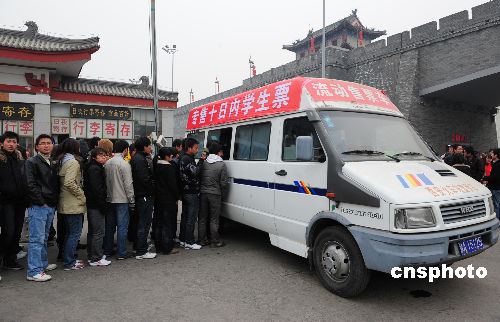 2009年1月5日,學(xué)生在西安火車站廣場上的流動(dòng)售票車前排隊(duì)購買火車票。春運(yùn)臨近,鐵路迎來購票高峰,西安火車站的流動(dòng)售票車開進(jìn)車站廣場和大專院校,解決學(xué)生購票難題。據(jù)了解,今年春運(yùn),西安火車站發(fā)送學(xué)生將達(dá)到90萬人次,寒假高峰日均學(xué)生發(fā)送量3至4萬人,最高日將達(dá)6萬人。中新社發(fā) 唐振江 攝