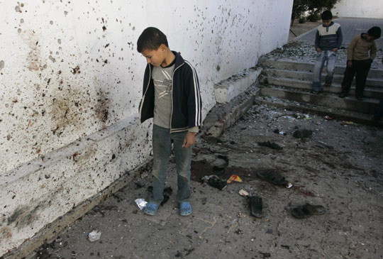 以色列部隊(duì)1月6日攻擊了加沙地區(qū)三處由聯(lián)合國設(shè)立的學(xué)校,造成數(shù)十名在學(xué)校內(nèi)逃避戰(zhàn)火的民眾喪生,另有百余人受傷。圖為巴勒斯坦兒童站在被以軍襲擊的聯(lián)合國學(xué)校外。