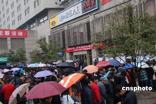 1月7日,在杭州城站火車站的售票大廳門前,排隊(duì)購(gòu)票的人群異常擁擠。由于細(xì)雨綿綿的天氣,使得大廳外排起了雨傘購(gòu)票的長(zhǎng)龍。中新社發(fā) 張潔 攝