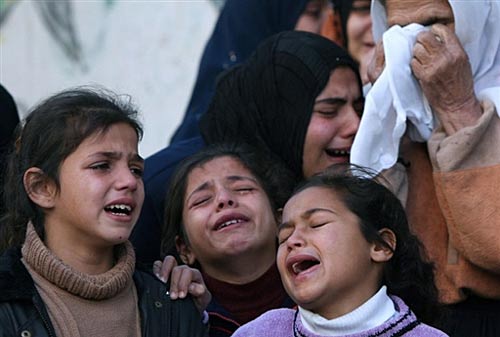 巴勒斯坦人7日大規(guī)模悼念因以色列空襲聯(lián)合國學(xué)校被炸死的民眾,悼念活動現(xiàn)場擺放著其中43人的尸體。共有48人在空襲中喪生。