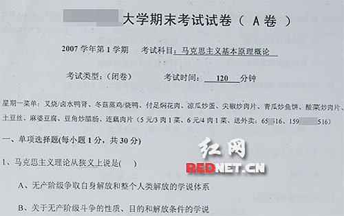 “星期一菜單:叉燒鹵水鴨腎,冬菇蒸雞燒鴨……”近日,一篇題為《受不了了!最雷人的大學(xué)試卷印有外賣廣告》的帖子在網(wǎng)上流傳,從帖中圖片可以看到廣州某高校期末試卷每一頁(yè)的空白部分印著快餐店的外賣廣告,試卷上顯示的是2007學(xué)年第1學(xué)期,考試科目為馬克思主義基本原理概論。這份“史上最雷人的大學(xué)試卷”立刻成為網(wǎng)友議論的焦點(diǎn)。