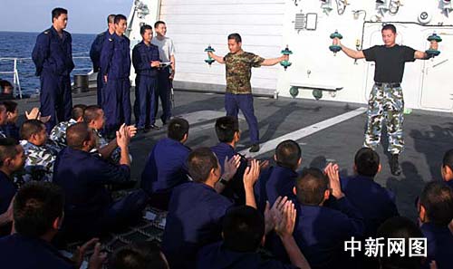 中新網(wǎng)“?凇迸1月9日電,中國(guó)海軍護(hù)航編隊(duì)“海口”號(hào)導(dǎo)彈驅(qū)逐艦舉行甲板運(yùn)動(dòng)會(huì),以豐富官兵在護(hù)航期間的文體生活,甲板運(yùn)動(dòng)會(huì)共設(shè)六個(gè)比賽項(xiàng)目,分三個(gè)下午舉行,今天首場(chǎng)舉行啞鈴、臂力棒項(xiàng)目的比賽。