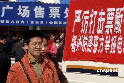 福州火車(chē)站廣場(chǎng)張貼舉報(bào)電話嚴(yán)打票販子。