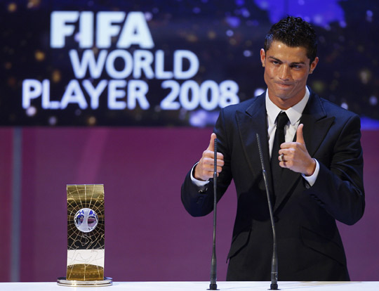 C羅在2007年世界足球先生評選中屈居卡卡、梅西之后排名第三,今年他終于如愿以償摘得桂冠。這也是葡萄牙繼菲戈之后又一位奪得世界足球先生榮譽的國腳。