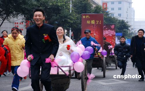 1月13日上午,一支由新郎拉著板車載著新娘的板車迎親隊,浩浩蕩蕩經(jīng)過重慶梁平縣城,沿途向行人撒喜糖、紅包,然后奔向新家。這支新穎、獨特的迎親板車隊,引得沿途行人駐足觀看,許多汽車主動停下讓道,并鳴笛向他們祝賀。沿途許多市民對他們這場婚禮贊不絕口,送上對新人的祝福。新郎周剛介紹,新娘黃林鳳家住廣西來濱市,她愿從那么遠的地方嫁過來,讓他很感動,就想以一種特別的方式娶她,因此請人策劃了這場婚禮。新郎稱,租汽車需花2000元左右,租10輛板車只花了400元,用板車比汽車節(jié)約,其實節(jié)約這點錢對他們來說不算什么,但主要的是這種形式終身難忘,要的是倡導婚事新辦節(jié)約。當天他們向行人撒了約5公斤喜糖,撒了200個、內(nèi)裝2元錢紅包。中新社發(fā) 木文 攝