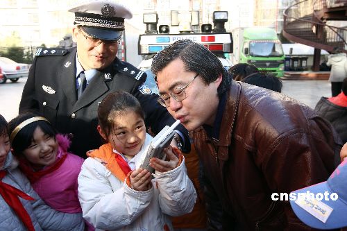 1月14日,北京崇文區(qū)交通支隊民警為崇文小學(xué)學(xué)生和家長講授交通安全課,家長當(dāng)場向自己的孩子簽署交通安全承諾書,承諾在節(jié)日期間不酒后駕車、不闖紅燈、不疲勞駕駛,與孩子度過安全、快樂的假期。圖為小學(xué)生學(xué)習(xí)用酒精監(jiān)測儀測試自己的家長。中新社發(fā) 杜洋 攝