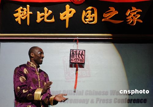 當(dāng)?shù)貢r間一月十五日,美國NBA巨星科比·布萊恩特中文官方網(wǎng)站“科比中國之家”在洛杉磯正式開通,身著唐裝的科比親自參與并親自開通網(wǎng)站。中新社發(fā) 張煒 攝