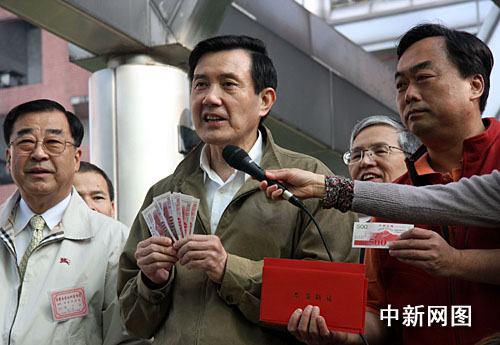 1月18日上午,備受全臺(tái)和外界關(guān)注的消費(fèi)券開始在臺(tái)灣各發(fā)放所發(fā)放。圖為馬英九今天上午九時(shí)許來(lái)到臺(tái)北市第1291號(hào)消費(fèi)券發(fā)放所領(lǐng)取消費(fèi)券。馬英九隨后發(fā)表講話,呼吁臺(tái)灣全體民眾善用消費(fèi)券,積極促進(jìn)內(nèi)需,擴(kuò)大消費(fèi)。陳立宇 攝