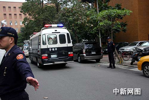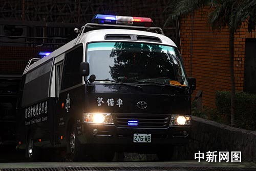 1月19日,臺北地方法院首次開庭審理前臺灣地區(qū)領(lǐng)導(dǎo)人陳水扁家弊案。傳訊陳水扁到地院準(zhǔn)備程序庭。圖為下午庭審結(jié)束,警備車押著陳水扁離開臺北地院鐵門,返回臺北土城看守所場景。作者:陳立宇