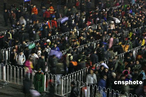 2009年1月19日晚,北京西客站客流大幅攀升,廣大旅客通過S形護欄有序進站。面對今年的春運客流,北京西站充分借鑒奧運場館觀眾分流經(jīng)驗,提前部署,及早安排,在客流密集的北廣場東西雙向設(shè)置了兩處S形護欄,由工作人員在入口處指揮,分流、引導(dǎo)旅客有序進站,確保了春運安全。 中新社發(fā) 魯谷 攝