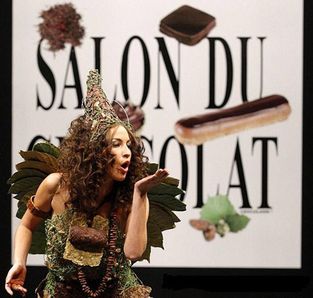 2008年10月28日,在法國(guó)巴黎舉行的第14屆巧克力展上,一名法國(guó)藝術(shù)家在展示一款用巧克力修飾的服裝。