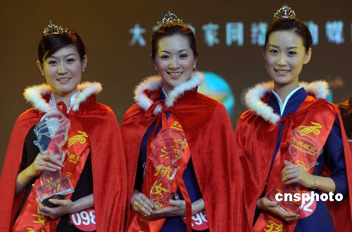 一月二十一日晚,臺(tái)灣籍空姐曾怡綸(中)奪得“深航女孩”總決賽冠軍,空姐常藝(左一)、魏禎(右一)分別獲得亞、季軍。