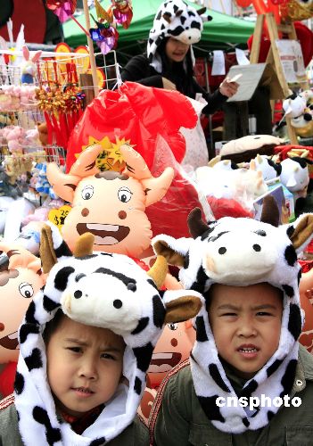 一月二十五日是中國農(nóng)歷大年三十,一對(duì)雙胞胎兄弟在香港年貨市場上頭戴卡通牛,惹人喜愛。中新社發(fā) 張勤 攝