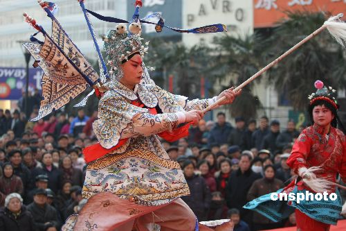 1月26日,安徽淮北市兩宮廣場露天戲臺(tái)上,市民們?cè)谟^看豫劇表演。當(dāng)日,正月初一,淮北素有正月唱大戲的習(xí)俗。每年正月初一到十五,到處都能看到平地搭建的露天戲臺(tái)。中新社發(fā) 王璋聞 攝