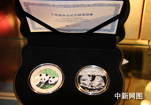 為紀(jì)念大熊貓團(tuán)團(tuán)、圓圓來臺與民眾見面。位于臺北市和平東路三段68——1號的臺灣大洋金銀幣有限公司特委請深圳國寶鑄幣廠和臺灣“中央鑄幣廠”鑄造大熊貓赴臺紀(jì)念銀章和大熊貓來臺紀(jì)念銀章各一枚供臺灣民眾選購。中新社記者 陳立宇 攝