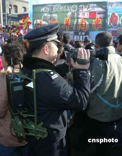 今年春節(jié),在北京的廟會(huì)上,市民可以看到背著“無(wú)線(xiàn)電小背包”,手拿攝像機(jī)“逛”廟會(huì)的警員。這是北京宣武警方首次將奧運(yùn)安保裝備運(yùn)用于廟會(huì)的安全保障。中新社發(fā) 湯亮 攝