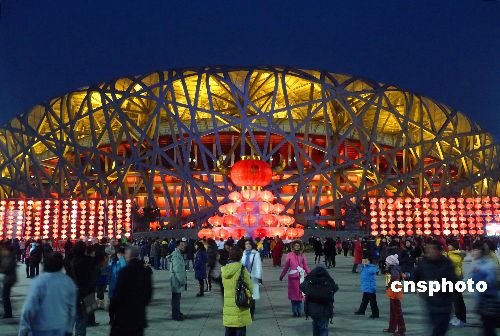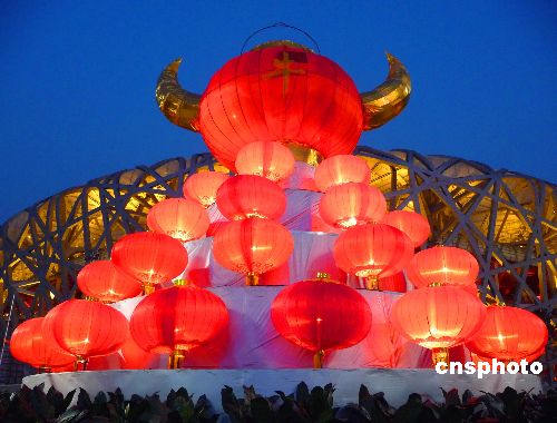2009年1月31日傍晚,在北京奧林匹克公園中心區(qū)內(nèi),“金牛獻(xiàn)!、“年年有余”、“鴻福滿倉(cāng)”等鋼材結(jié)構(gòu)的雕塑及數(shù)千個(gè)大紅燈籠,在牛年春節(jié)期間首次被安放在園區(qū)人流較集中的地方,與“鳥巢”、“水立方”交相輝映。中新社發(fā) 玉龍 攝