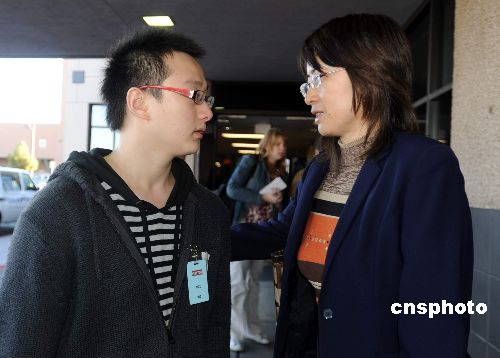 當(dāng)?shù)貢r(shí)間一月三十一日下午,中國(guó)駐洛杉磯副總領(lǐng)事黃曉健(右)在內(nèi)華達(dá)大學(xué)醫(yī)療中心和中國(guó)游客小洪(左)交談。小洪是沒(méi)有參加大峽谷一日游而躲過(guò)一劫的五名中國(guó)游客之一,而小洪的父母受傷嚴(yán)重,尤其是母親傷勢(shì)危重。中國(guó)游客當(dāng)?shù)貢r(shí)間一月三十日下午在美國(guó)亞利桑那州的九十三號(hào)公路上遭遇嚴(yán)重車(chē)禍,造成七人遇難、十人受傷。中新社發(fā) 張煒 攝