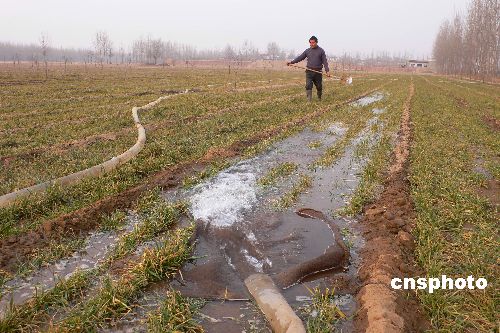 2月3日下午,開封市仙人莊村農(nóng)民在田間澆灌小麥。面對嚴(yán)重的旱情,河南省開封市各縣區(qū)積極組織群眾迅速行動,做好以抗旱澆麥為重點(diǎn)的麥田管理工作,力爭今年夏糧豐收。
