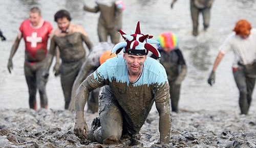 泥潭賽跑:英國埃塞克斯郡舉行的瘋狂泥潭賽跑大賽,200多名參賽者打扮成小丑、牛仔或圣誕老人的樣子,在黑乎乎的泥巴中盡情“狂奔”。