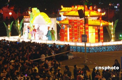 二月五日晚,福州元宵燈會在市區(qū)五一廣場、南后街同時正式亮燈,數(shù)百盞花燈呈現(xiàn)出濃濃的節(jié)日氣氛。福州五一廣場展出的一系列反映“老福州”傳統(tǒng)民俗文化內(nèi)容的燈組,吸引絡(luò)繹不絕的福州市民前來賞花燈。中新社發(fā) 劉可耕 攝