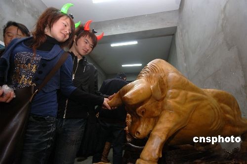 2月5日晚,一對(duì)戴著“牛角”的情侶共同摸一雕塑牛角祈求好運(yùn)。牛年伊始,福州許多市民走上街頭游玩,看到牛造型的飾品都會(huì)摸之祈求好運(yùn)。中新社發(fā) 王東明 攝