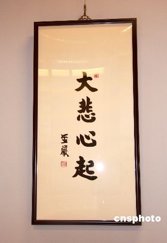 臺灣法鼓山創(chuàng)辦人圣嚴(yán)法師三日圓寂,四日移靈金山法鼓山世界佛教教育園區(qū)大殿供信眾瞻仰,圖為法鼓山現(xiàn)正展出的圣嚴(yán)法師墨寶“大悲心起”。中新社發(fā) 陳立宇 攝