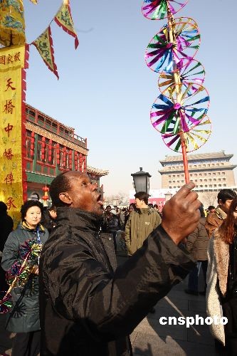 元宵節(jié)來臨,北京前門大街舉行民間花會踩街活動,一名外國觀眾手舉風車玩得很過癮。踩街是一種中國傳統(tǒng)民間民俗藝術表演形式,類似國外的花車游行,表演隊伍邊行進邊表演,百姓沿途觀看。中新社發(fā) 杜洋 攝