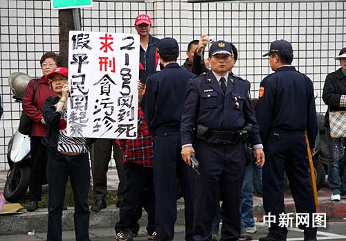 1月10日下午,吳淑珍離開法庭時有民眾在地院門口舉標語牌。中新社記者 陳立宇 攝