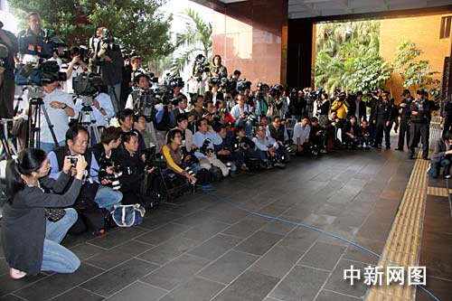 大批各路媒體記者集結在臺北地院門口候著吳淑珍出來。中新社記者 陳立宇 攝