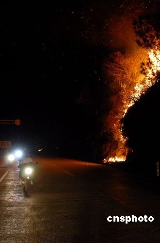 圖為高砂鎮(zhèn)境內(nèi)的公路上,來往的車輛從火叢旁穿流而過。中新社發(fā) 李劍準(zhǔn) 攝
