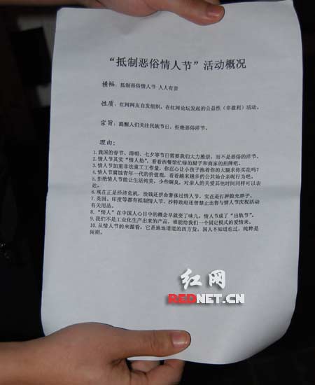 其中,組織者“小溪里的石頭”還給記者看了一份他們的組織概況,其目的就是要提醒人們關注民族節(jié)日,拒絕惡俗洋節(jié),并列舉了十大理由:我國的春節(jié)、清明、七夕等節(jié)日需要我們大力推崇。情人節(jié)其實是“情人劫”,看看西餐館忙碌的廚子和商家招牌就知道了。你忍心讓小孩子抱著你的大腿求你買花嗎?情人節(jié)腐蝕青年一代的價值觀,銅臭味道很濃,現(xiàn)在正是經濟危機,奢侈消費不妥當。“情人”在中國人心目中的概念早就變了味兒,情人節(jié)成了“出軌節(jié)”等等。