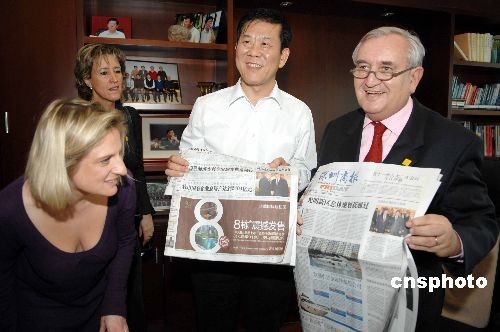 2月13日,法國前總理拉法蘭率領(lǐng)的法中友好代表團(tuán)一行參觀深圳市容市貌,包括地王大廈、博物館、市人大、中興通訊等,并題詞:登高望遠(yuǎn),利于友誼;未來在何方,也許就在這里。圖為拉法蘭喜閱中文報紙。中新社發(fā) 陳文 攝
