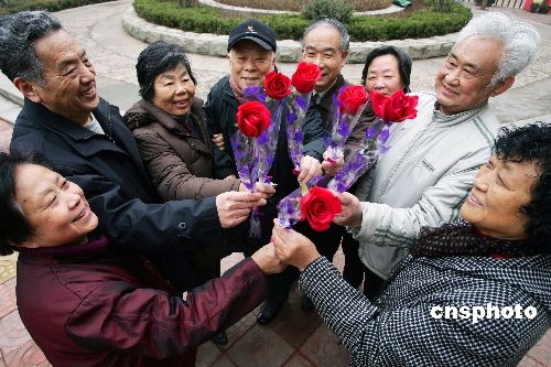 在山東濰坊市奎文區(qū)后門街社區(qū),一對對老年夫婦收到玫瑰花后喜笑顏開。在情人節(jié)來臨前,該社區(qū)開展了“執(zhí)子之手、與子偕老”活動,社區(qū)的老年夫妻互相送上了象征愛情的玫瑰花。中新社發(fā) 張馳 攝