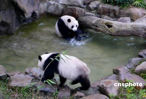 二月十四日,大陸贈(zèng)臺(tái)大熊貓“團(tuán)團(tuán)”和“圓圓”首次在臺(tái)北新家的戶(hù)外展示場(chǎng)與游客見(jiàn)面,再度掀起臺(tái)灣民眾的參觀熱潮。當(dāng)天,“團(tuán)團(tuán)”“圓圓”到戶(hù)外活動(dòng)的興致極好,常在草地上撒歡奔跑,“團(tuán)團(tuán)”樂(lè)山,不時(shí)爬到山坡的最高點(diǎn)俯視全場(chǎng); “圓圓”喜水,不時(shí)走進(jìn)水池戲水玩耍。中新社發(fā) 路梅 攝