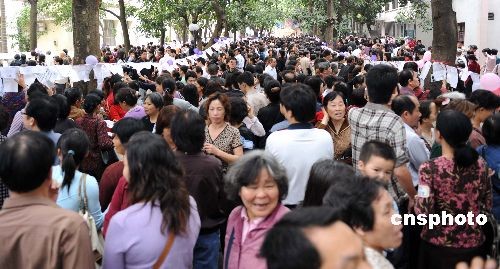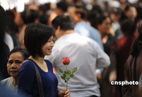 二月十四日,情人節(jié),廣西南寧市組織大型相親交友活動(dòng)。這場(chǎng)名為“媽媽相親團(tuán)”的交友活動(dòng),由于交友過程可由父母代勞,得到當(dāng)?shù)厍嗄甑臒崃掖蹬,?dāng)天有超過一萬名青年報(bào)名參與相親,場(chǎng)面十分火爆,眾多父母到場(chǎng)為兒女相親。中新社發(fā) 蔣雪林 攝