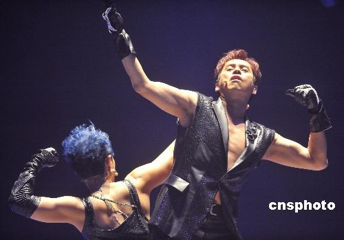 二月十四日晚,“香港二零零九東亞運(yùn)動(dòng)會(huì).左麟右李演唱會(huì)”在香港紅磡體育館作尾場演出。圖為歌星譚詠麟、李克勤特別為是次演唱會(huì)強(qiáng)身,兩人演出時(shí)不忘展示麒麟臂及胸肌。 中新社發(fā) 鄧慶樂 攝